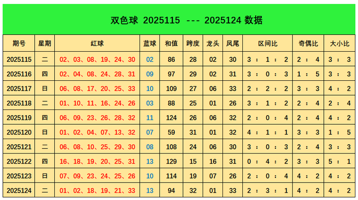 上期归来:双色球第2025124期开出奖号:红球01、02、18、19、21、33;蓝球13,其中红球三区比为2:3:1,奇偶比4:2,大小比为4:2,蓝球开出1路号码13。