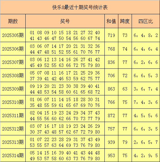 惬心8第2025314期奖号开出:05 14 15 16 39 40 41 43 44 48 49 53 57 58 60 63 73 76 79 80,其中奖号和值为953,跨度为75,四区比为4:2:9:5。