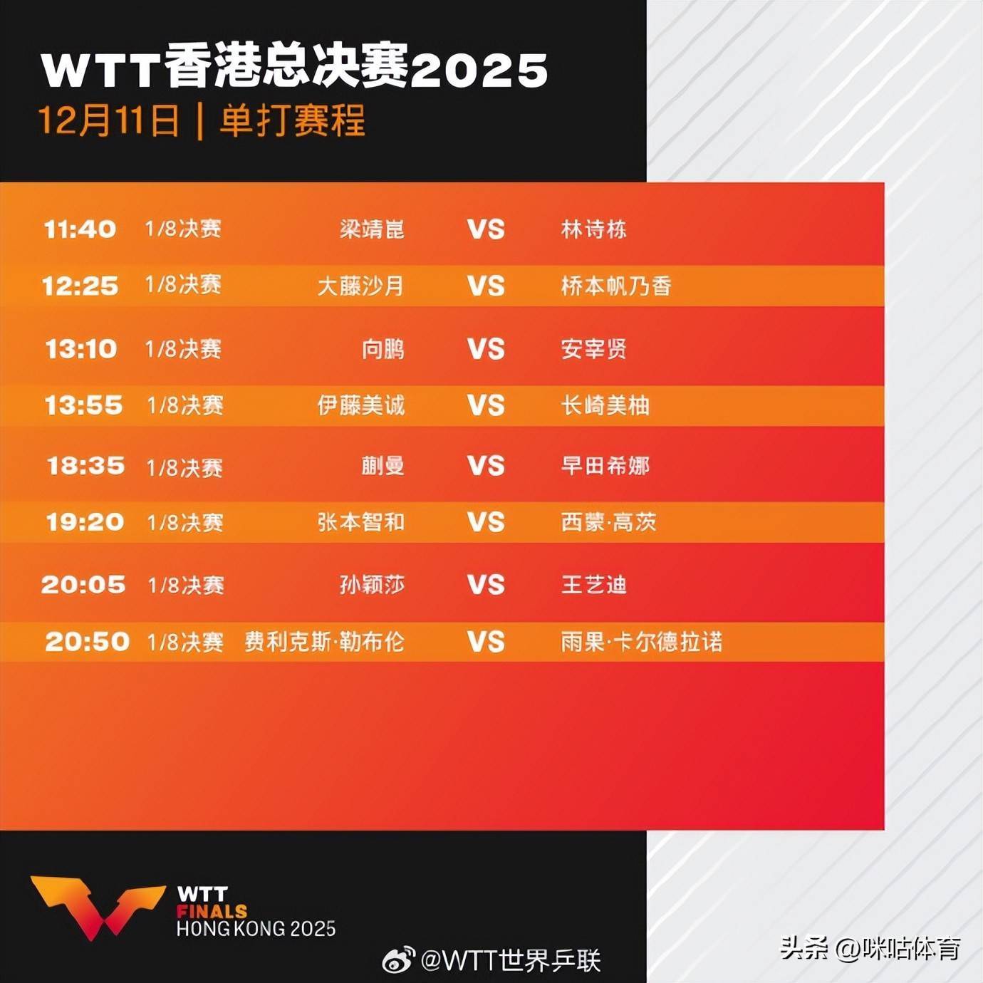 北京时辰 12 月 11 日,2025WTT 香港总决赛参预第二个比赛日的角逐。笔据赛事总体安排,当日将不绝股东混双小组赛的争夺,同期全面打响男、女单打 1/8 决赛,历经多场强强对话后,单打神色标 8 强名单将厚爱出炉。以下是当日齐全赛程安排及亮点解读,一同聚焦赛场焦点: