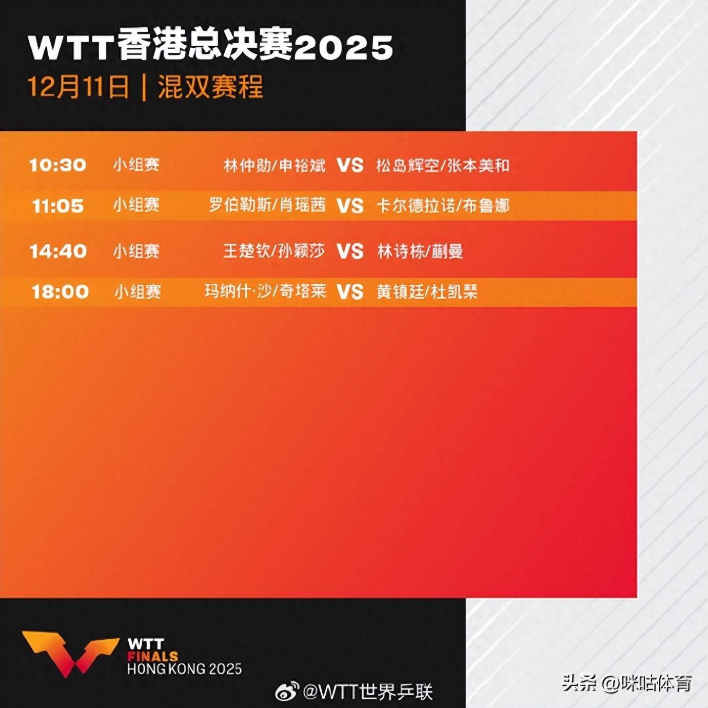 14:40 混双小组赛:王楚钦 / 孙颖莎(中国)vs 林诗栋 / 蒯曼(中国)