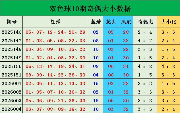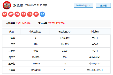 双色球26004期开奖,本期奖号红球03 07 08 09 18 32,蓝球10。当期红球号码大小比为2:4,三区比为4:1:1,奇偶比为3:3。阵势方面,红球开出1组连号07 08 09;1枚重号09。蓝球开出遗漏5期的大偶号码10。
