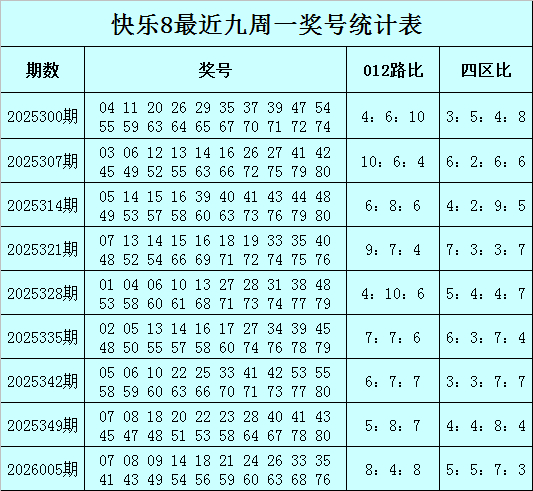 福彩风光8第2026005期(上周一)开奖转头:07 08 09 14 18 21 24 26 33 35 41 43 49 54 56 59 60 63 68 76,其中奖号四区比为5:5:7:3,012路比为8:4:8。