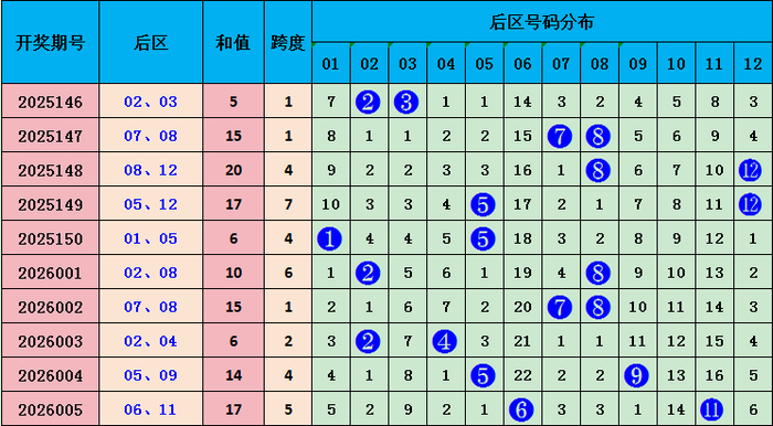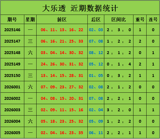 上期后区开出号码06 11,和值17,近十期和值5 15 20 17 6 10 15 6 14 17,和值波动界限较大,本期预测和值会着落,重心柔和号码:02 03,和值5。