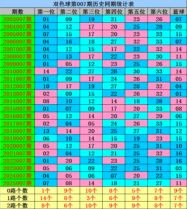 第四位:历史同时0路红球开出:15、18、21、24、27;1路红球开出;07、22、25、28;2路红球开出;14、17、20、23,红球012路个数比为8:6:9,前年同时开出0路奖号之后,本年同时防0路红球再出,参考红球21。