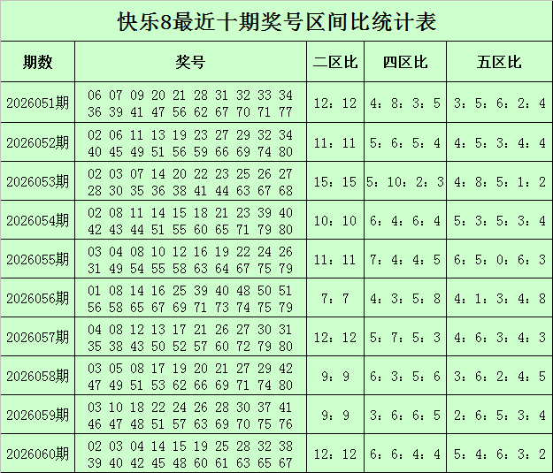福彩惬心8第2026060期开奖转头:02 03 04 14 15 19 25 28 32 38 39 40 42 45 48 60 61 63 65 67,其中奖号二区比为8:12,四区比为6:6:4:4,五区比为5:4:6:3:2,除2尾数比为10:10,除4尾数比为6:4:4:6,除5尾数比为6:1:4:5:4。